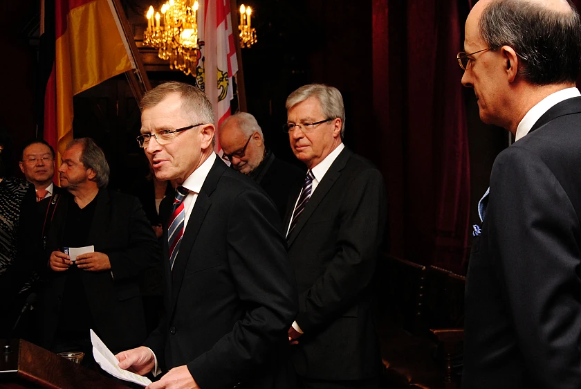 Über 400 Gäste konnte Bürgermeister Jens Böhrnsen am 15.1.2014 in der Oberen Halle des Alten Rathauses zum Neujahrsempfang des Senats begrüßen. Prof. Dr. Konrad Elmshäuser, Leitder des Bremer Staatsarchives, erinnerte in einer Festansprache an 1914 und den Ersten Weltkrieg. Er rief dazu auf, als Lehre aus der Vergangenheit den heutigen supranationalen Zusammenschlüssen wie Europa mehr Wertschätzung entgegenzubringen.
