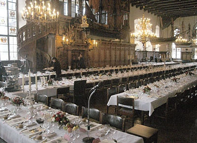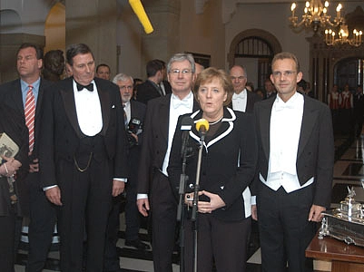 Bürgermeister Jens Böhrnsen(links) und Bürgermeister Thomas Röwekamp hatten die Kanzlerin kurz vor Beginn des fast fünfstündigen Essens im Rathaus im Namen des Senats und aller Bremerinnen und Bremer herzlich willkommen geheißen. „Ich fühle mich sehr geehrt, heute hier im Rathaus als Bundeskanzlerin und bei der Schaffermahlzeit als erster weiblicher Ehrengast zu sein“, erwiderte Angela Merkel und fügte verschmitzt hinzu: „Was lange währt, wird endlich gut“. Bezogen auf den Standort Bremen im EADS-Konzern sagte die Bundeskanzlerin erneut die nachdrückliche Unterstützung der Bundesregierung bei der Sicherung von Arbeitsplätzen zu.