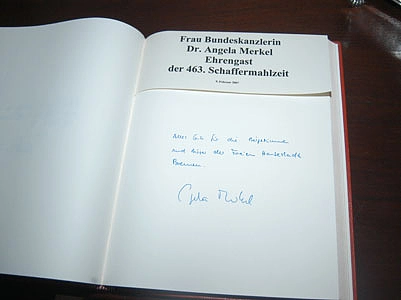 „Alles Gute für die Bürgerinnen und Bürger der Freien Hansestadt Bremen“. Mit diesen Worten hat sich heute (9.Februar 2007) Bundeskanzlerin Angela Merkel in das Goldene Buch der Stadt eingetragen. Die Kanzlerin nimmt als erster weiblicher Ehrengast an der 463. Bremer Schaffermahlzeit, einem der ältesten Brudermahle der Welt teil.