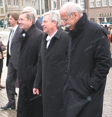 „Ich bin sehr gerne nach Bremen gekommen und freue mich, Gast der Schaffermahlzeit zu sein“, sagte Christian Wulff heute (12.02.2010) bei seinem Eintreffen im Bremer Rathaus auf Fragen der zahlreichen Journalisten. Der niedersächsische Ministerpräsident verwies dabei auch auf die vielen Verbindungen, die es zwischen Niedersachsen und Bremen gäbe. Allein die vielen Menschen, die jeden Tag aus Niedersachsen zu ihrem Arbeitsplatz nach Bremen fahren oder umgekehrt aus Bremen nach Niedersachsen einpendeln, seien ein Beweis für gute Nachbarschaft. Diese müsse gelebt werden. Als gute Beispiele nannte er unter anderem die Eingliederung der niedersächsischen Luneplate in bremisches Hoheitsgebiet sowie die erfolgreiche „Nord-Allianz“ der norddeutschen Küstenländer.